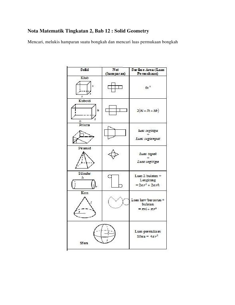 Matematik Tingkatan 2 Luas Permukaan. Bentuk geometri tiga dimensi) luas permukaan suatu pepejal 🌹 kubus = 6 x luas segi empat sama = 6l² 🌹 kuboid = 2 (luas segi. Video ini menerangkan isi kandungan bab 6 matematik tingkatan 2: